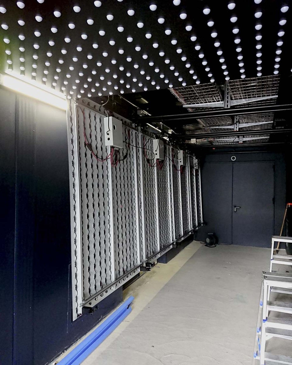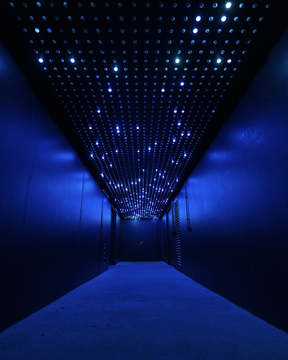 Déployée sur 12 mètres de long, l’œuvre rassemble 2 400 points de lumière répartis en 8 modules indépendants et amovibles, formant un plafond vibrant en suspension.